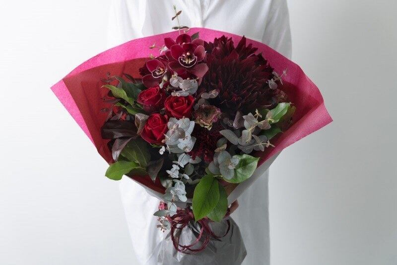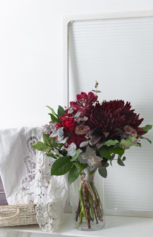 トーンをおさえたグッと大人な赤いお花を集めて束ねました。