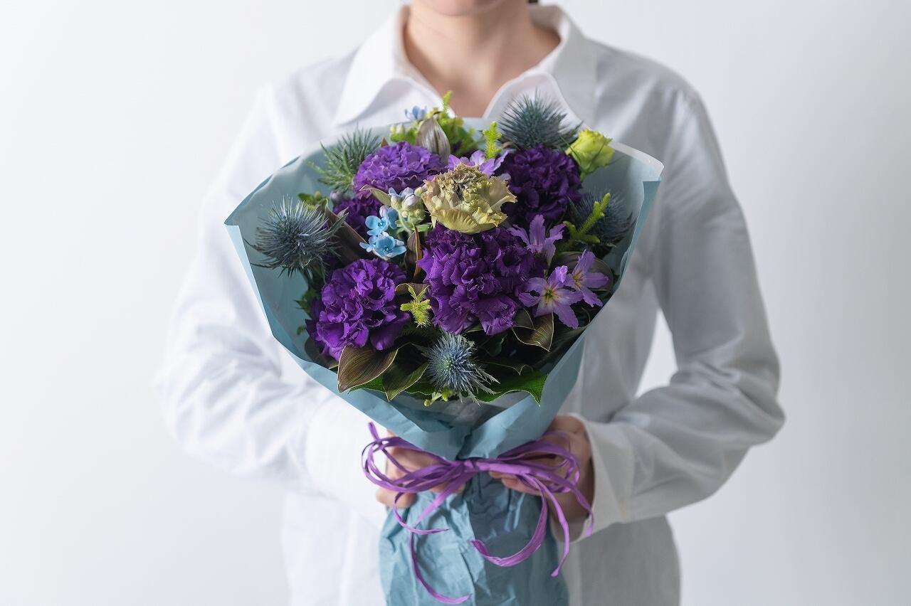 ソリッドでクールカラーの季節のお花を集めて束ねました。