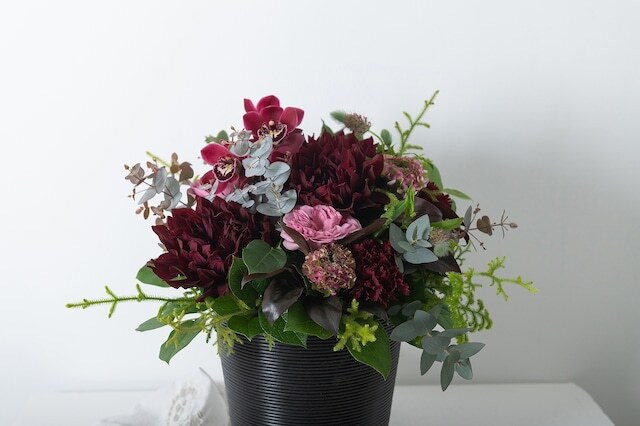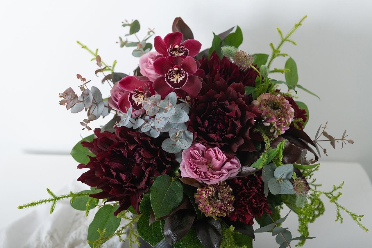 トーンをおさえたグッと大人な赤いお花を集めて束ねました。