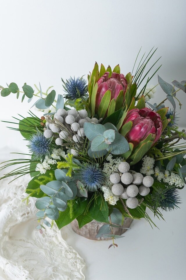 個性的なお花を束ねたアレンジメントです。