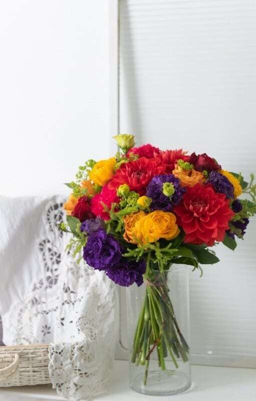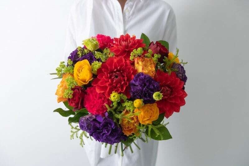 目にも鮮やかな色とりどりの季節お花を集めて束ねました。
